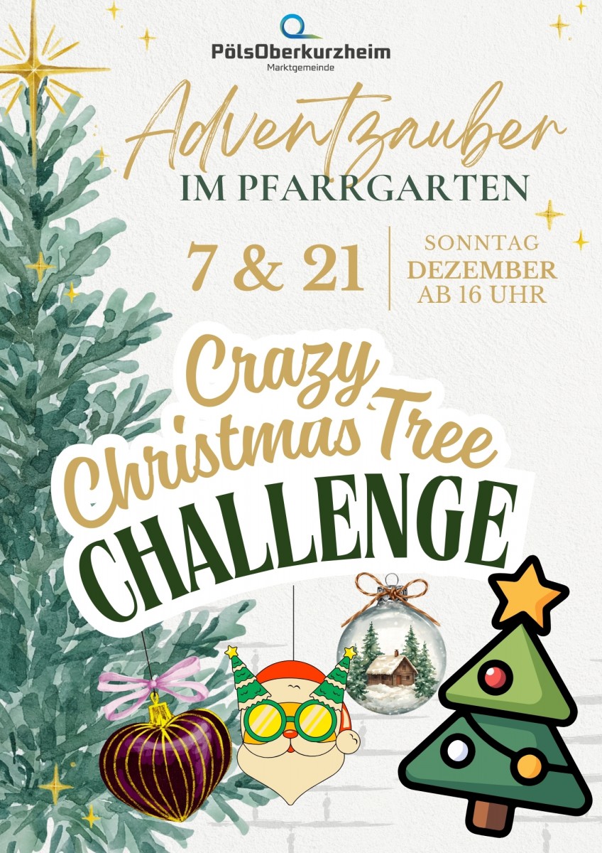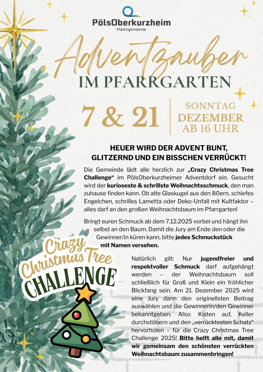 Die Gemeinde lädt alle herzlich zur „Crazy Christmas Tree Challenge“ im PölsOberkurzheimer Adventdorf ein.